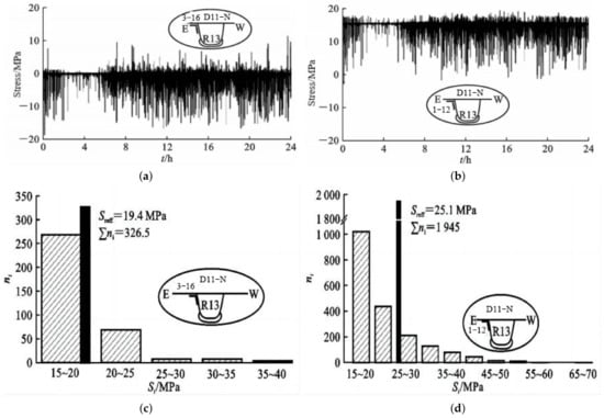 Measured stress time histories and stress spectrum []: (a) 24 h stress time records at RD-D; (b) 24 h stress time records at RD-R; (c) One-week stress spectrum at RD-D; (d) One-week stress spectrum at RD-R.