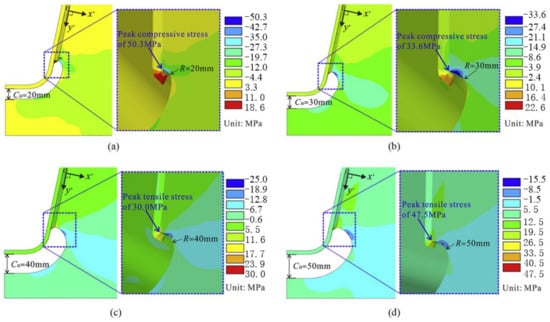 Stress contour plots for four different cutout clearances. (a) 20 mm. (b) 30 mm. (c) 40 mm. (d) 50 mm.