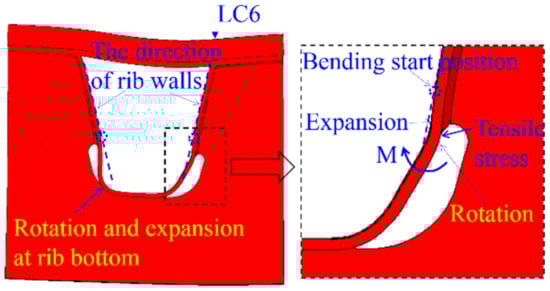Based on a steel–UHPC composite deck bridge, Xiang [,] carried out both the field testing and multi-scale FEM analysis to investigate the fatigue behavior of wrap-around weld at the rib-to-floorbeam (RF) joint. It was found that the stress behavior at fatigue details was extremely sensitive to the localized effect of axle loading instead of whole truck weight. Since significant stress concentration and a high-stress gradient exist in the wrap-around weld, it is essential to utilize the hot-spot stress approach rather than the nominal stress approach. The wrap-around weld presents an obvious out-of-plane bending deformation, which results from the torsion effect and Poisson’s effect, as shown in Figure 14.