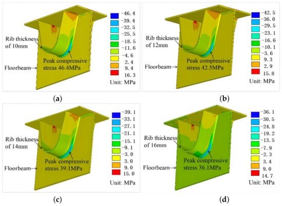 Zhu [,] built a steel-box girder model with the OSD stiffened by the UHPC, and the hot-spot stress was employed to obtain refined results from submodels. They compared the results with field measurements. It was found that a 45 mm thick UHPC layer on the OSB deck could reduce the stress range at the deck plate side of the RD detail by up to 70.9%, and increasing the cutout clearance could effectively decrease the stress range at the floorbeam side of RF joint. Figure 13 shows stress contour plots for four different cutout clearances. They recommended a combined use of a 50 mm thick UHPC layer with 40 mm cutout clearance to the steel–UHPC composite deck.
