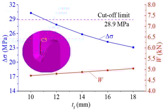 Zhan [] established an OSD panel finite element model in ANSYS, considering different UHPC thicknesses, diaphragm thickness, and stud spacing. The stress range at the typical fatigue details was calculated to evaluate their fatigue life based on the nominal stress method. The results found that the stress range at the RD details was greatly reduced under wheel loading, while the improvement on other details is relatively small. After using this composite deck, the RF detail became the fatigue critical detail, and increasing the diaphragm thickness could greatly reduce the stress range at the RF details.