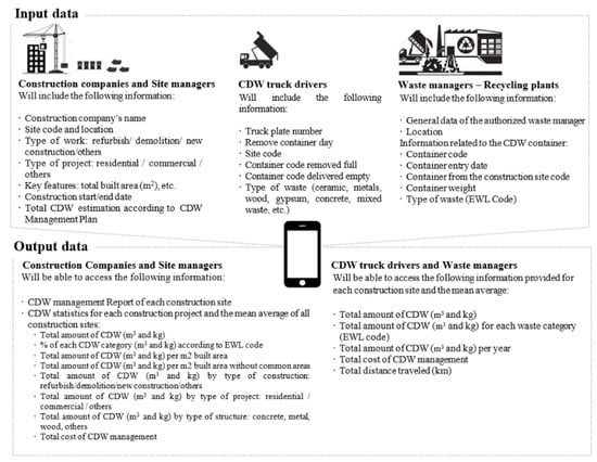 In addition, the input data and expected outcomes of the app were also asked about during the interviews and were all collected. Figure 4 shows the needed information to be incorporated into the app as well as the expected results for each construction agent.