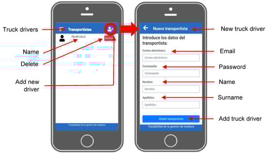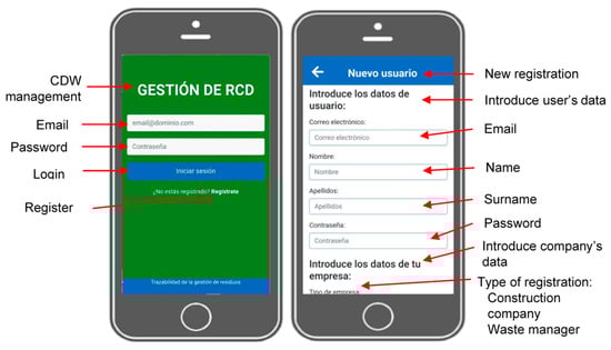 The app was developed so that on an initial page were the different agents managing CDW are to be registered and to login. Each construction agent can access the app and include information regarding CDW management, depending on their role: construction company, CDW site manager, CDW waste manager, and CDW truck driver. The construction company and the waste managers must include their login details to access the system, while the site managers and truck drivers must be previously registered in the system by the construction company or the waste managers (Figure 5).