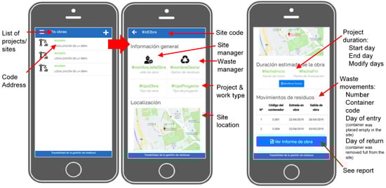 The construction company must enter the information related to the construction site: location, name of construction site manager, name of the waste manager, type of construction and project, estimated project duration, CDW containers, and CDW report (Figure 6). There is a search tab for the list of construction sites assigned to the different construction companies in the system. Each site will be identified by a unique code and location. The general information of each site is shown and the data allows users to consult the information related to the work. In addition, the construction company can also generate a PDF report to have a detailed relation of the waste generated at a specific construction site. However, this feature of the app is currently under development.