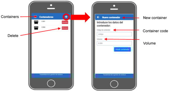 The authorized manager must enter the information concerning the waste containers into the application (Figure 7). To register a new container in the system, you must click on the button located at the top right of the list of containers and introduce the required data: container code and volume (m3). This is a key step to identify the waste and carry out its traceability.