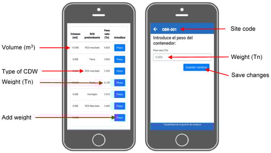 Currently, the development of mobile apps has an exponentially growing market around the world. Kaur and Kaur [23] reviewed the growing use of mobile apps running on smartphones, tablets, laptops, and other mobile devices. In the field of construction waste management, the works of Oliveira et al. from 2019 [24] and Attia et al. from 2021 [25] can be highlighted. In Spain, the Association of Construction Materials Companies (Asemaco, Pontevedra, Spain) has developed a mobile application for the management of construction waste generated in civil construction and demolition works [26]. It is available for Android and incorporates a complementary web app for waste calculation, providing the site agent with an extra tool to estimate the quantities of waste produced on site.