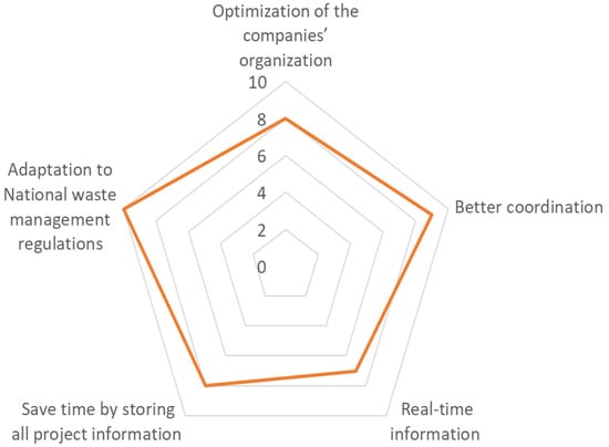All the interviewees agreed that the developed app can help waste managers and construction companies to meet the requirements of the current regulations regarding CDW management. For instance, CDW managers have access to the CDW containers’ movements and therefore are able to monitor what occurs during the waste logistics, speeding up the process, and construction companies can access the list of their construction sites to supervise CDW management. In addition, construction companies will have a record of the amount of CDW generated in each of their projects and the amount of waste generated per construction activity, and therefore, they will have the needed data to obtain their own CDW generation ratios to develop the future documents ‘CDW Report’ and ‘CDW Plan’ established by the law.