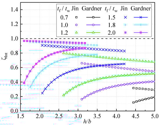where is the interaction coefficient mainly dependent on the ratio of buckling stresses of the isolated, simply supported flange and web, , which was provided to quantify the degree of rotational restraint provided at the conjunction edge. The superscripts “SS” and “F” in Equation (1), respectively, represent the fixed and simply supported boundary conditions, while the subscripts “cs” and “p” mean the cross-section and isolated plate, respectively. It is worth mentioning that the subscript “p” cannot be directly replaced with either “w” (i.e., the web) or “f” (i.e., the flange), as is actually the minimum of and . Likewise, is the minimum of and . A similar method as Gardner and Fieber [,] was also adopted by Jin and Tong [] to consider the interaction between the flanges and the web of I-section members at the local buckling. Using about 3500 results from the finite element analyses, approximate solutions were also presented for the interaction coefficient. However, as illustrated in Figure 1, significant differences may exist between the interaction coefficients of the above two studies for I-sections under axial compression. In the recent numerical study by Vieira et al. [], the local buckling of RHS members with equal flange and web thicknesses was studied based on the General Beam Theory. Subsequently, the approximate polynomial expression of the buckling coefficient kw was proposed, and a chart was also provided for the association of this expression.