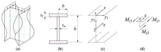 As depicted in Figure 2a, an I-section column may fail into the local buckling with a series of half-waves. In the local bucking analysis of such a column, a segment with its length equal to one half-wave is frequently adopted, as the inflection points of the local bucking deformations can be regarded as simply supported conditions. For ease of description, two local Cartesian coordinate systems, x-1-y1 and x-2-y2, are established for the flange and web of the I-section (Figure 2a–c). As shown in Figure 2c, the origin of x-2-y2 for the web plate is located at the midpoint of the loaded edge, while the origin of x-1-y1 for the flange plate is set at the flange-web conjunction. The longitudinal axes of both coordinate systems are denoted as x, as shown in Figure 2c. The parameters for the dimensions of the cross-section are illustrated in Figure 2b, where is the distance between the centerlines of the two flanges, is one half of the width of the flange, and and are the thicknesses of the flange and web of the I-section, respectively.