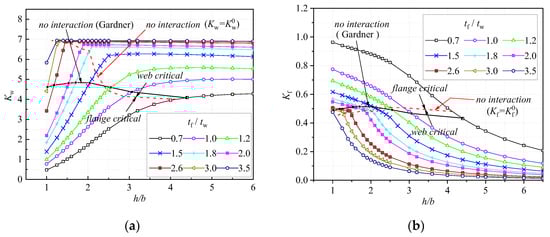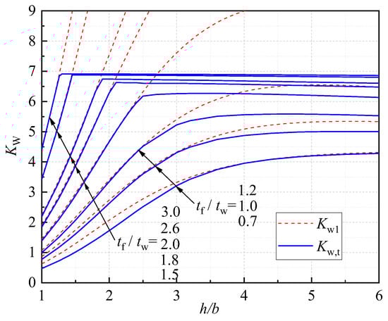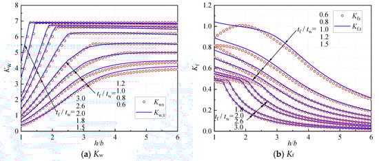 The results of Equations (17a) and (17b) using the iterative code of Matlab (denoted as the theoretical results) are shown in Figure 3a,b, for Kw and Kf, respectively. In the iterative code, the elastic modulus E and Poisson’s ratio μ of material are taken as 206,000 N/mm2 and 0.3, respectively. This is also used in the analyses in the rest of this paper, unless otherwise stated. It is worth mentioning that Kw represents the buckling coefficient of the web corresponding to the minimal buckling stress, which is obtained by searching for the minimal solution within the half-wave parameter being 0.5–5.0 for each case in the calculation. The value of Kf is then gained from the relationship illustrated in Equation (19a). It can be seen from Figure 3a that each Kw versus h/b curve contains an ascending branch at the stage with a relatively small h/b due to the increase in the rotational restraints from the flanges. This interaction at local buckling between the web and flanges, in turn, results in a reduction in the buckling resistance of the flanges, as indicated in Figure 3b for Kf. Kw reaches its peak value at a certain h/b, where the rotation of the web is almost fully restrained by the flanges, and therefore Kw remains almost constant with the further increase of h/b.