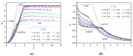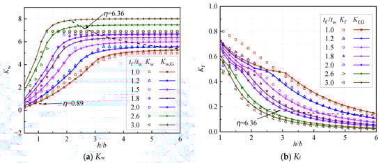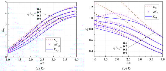 Seif and Schafer [] have revealed that the use of the parameter is more reasonable than the commonly used h/b in illustrating the interaction between the web and flanges of the cross-section at the local buckling. Therefore, the variations of Kw and Kf against the parameter are also shown in Figure 4a,b. It can be seen from Figure 4a,b that the correlations of curves for Kw and Kf with different are significantly improved by using the parameter as the horizontal axis compared with Figure 3a,b.