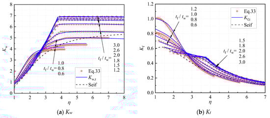 It can be seen from Figure 10a,b that the buckling coefficients using Equations (33a) and (33b) (Kws and Kfs) are in very good agreement with the theoretical results (Kw,t and Kf,t) for all cases. It should be noted that slight deviations (within 10%) can be found between the predictions of Equation (33b) and the theoretical results for cases with and . Fortunately, is rarely used in practice, and the predictions of Equation (33b) are conservative compared to Kf,t.