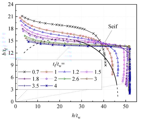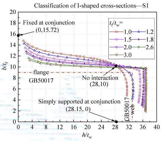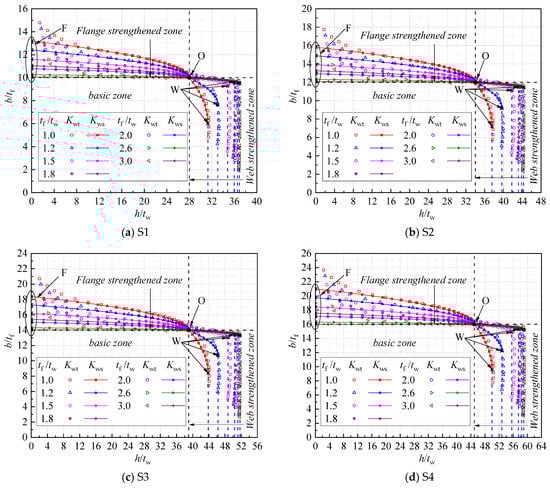 In Figure 14a–d, –0.8 of is taken in determining the limits of the width-to-thickness ratio of Classes S1–S4, similar to the method used in GB50017-2017. The I-section columns with tf/tw being 1.0–3.0 are only considered in Figure 14a–d, considering their practical use. As shown in Figure 14a–d, the whole region can be divided into three zones: the basic zone, the flange-strengthened zone and the web-strengthened zone. The limits of the width-to-thickness ratio of the flanges and web can be increased due to the flange–web interaction at the local buckling of I-section columns in the flange-strengthened zone and web-strengthened zone, respectively.