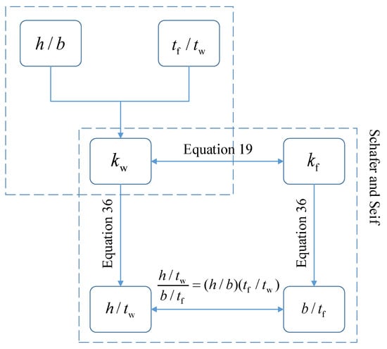 However, the interactive behaviors between different plate components of thin-walled sections have been investigated in many studies. Based on the analytical [,,,,,], numerical [,,,,,,] and experimental studies [], it has been found that the effects of these interactions may be significant. In Kroll et al. [], the buckling coefficient of the web of I-sections, , was acquired by either applying the principles of moment distribution to the stability of plates [] or an alternative procedure using charts of references [,,]. In the latter method, the flange or web was assumed to be elastically restrained, and the buckling coefficient was given in the form of tables and charts. Based on the results from the finite strip analyses, Schafer and Seif [] presented a normalized nondimensional parameter to account for the interaction between the web and flanges of I-sections at the local buckling. Subsequently, approximate expressions for the elastic buckling coefficient were proposed, which provide conservative predictions in most cases.