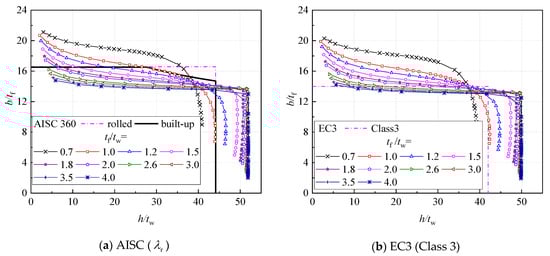 The comparisons between the predictions of EC3 [] and those using the method of this study for the Class 3 section are also made in Figure 16b. It can be seen from Figure 16b that the predictions of EC3 [] on the width-to-thickness limits for both webs and flanges are a little conservative compared to those of AISC 360 []. The predictions of EC3 for Class 3 sections are generally conservative compared to the results based on the method of this study for Class 3 sections. As illustrated in Figure 13 and Figure 16a,b, the design codes may make unsafe predictions on the width-to-thickness limits of I-sections in some cases. Fortunately, the cases of tf/tw = 0.7 and 1 are not within the practical region, where all three design codes mentioned above may give unconservative predictions on h/tw. For AISC 360 [], a smaller limit of b/tf (about 13) is suggested to ensure the resistance of the I-section against the local buckling.