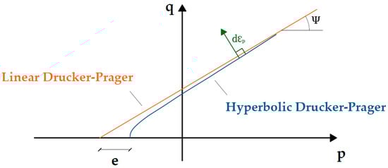Linear and hyperbolic Drucker–Prager non-associated plastic flow potential in the p–q plane.