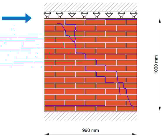 The bottom of the wall is effectively fixed to the ground, while at the top, after the application of the vertical load, the vertical displacements are constrained in order to avoid overturning phenomena. Figure 2 reports the boundary conditions for the lateral loading phase and the crack pattern registered in the J4D test with a prestressing load equal to 0.30 Mpa. All the walls of the JxD test group have dimensions of 0.99 × 1.00 m2 and are characterized by the presence of 18 total courses. Sixteen of them are active and two of them are fixed, each one in a steel beam.