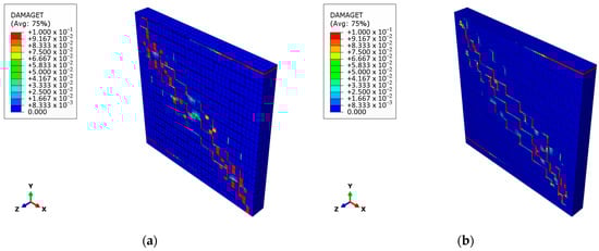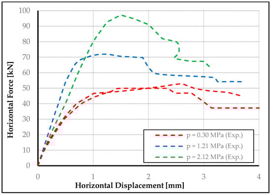 The vertical loads for the different JxD walls are 0.30 MPa (J4D and J5D panels), 1.21 MPa (J6D panel), and 2.12 MPa (J7D panel). As shown in Figure 3, the magnitude of the vertical load leads to different results both in terms of damage and panel strength. In detail, upon increasing the vertical load, the cracks have fewer joints and the horizontal strength increases coherently with frictional behavior.