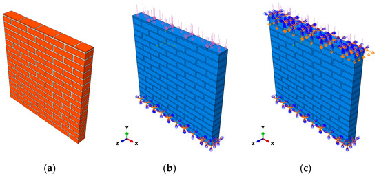 FE micro-model implemented in Abaqus: (a) View of the detailed definition of bricks and mortar joints (orange for bricks and white for joints); (b) application of the prestressing load at the top of the panel (pink arrows) and of the null displacement condition on the base; (c) application of the displacement conditions at the top of the panel for the shear test.
