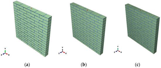 The different meshes created for the micro-models, with the representation of the control point adopted for the construction of the capacity curves: (a) Micro-model with average mesh size of 3 cm “MESH”; (b) micro-model with average mesh size of 1.5 cm “MESH +”; (c) micro-model with average mesh size of 1 cm “MESH ++”.