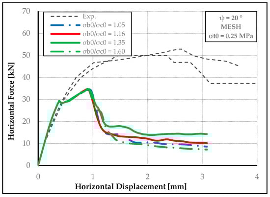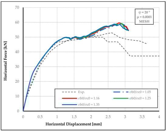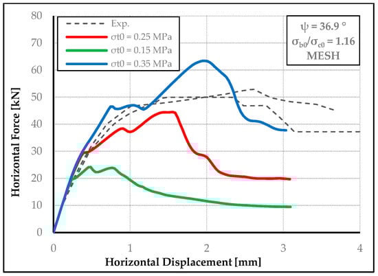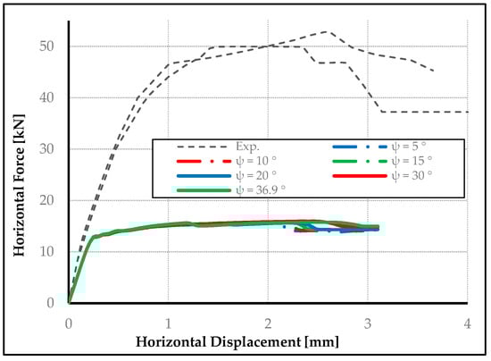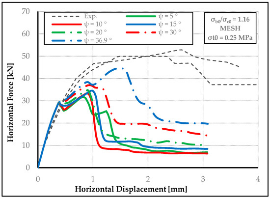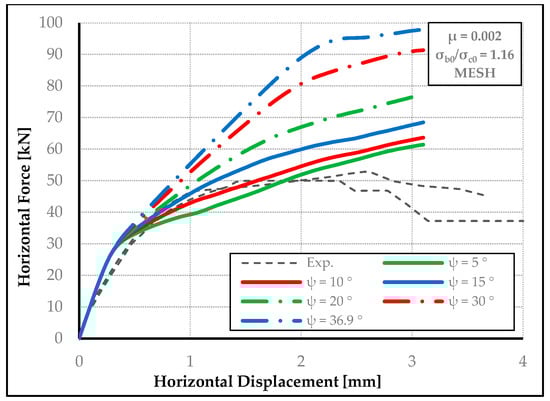 The results are compared in terms of force–displacement curves (see Figure 7). From the comparison of the curves, it is possible to observe that the dilation angle does not change the position of the first yielding point in the curves because it does not change the yielding surface, but only affects the plastic strains. Instead, the post-elastic response changes considerably with the dilation angle, with an increasing hardening with the dilation angle. This increase in resistance can be explained by the confinement effect that the dilation together with the boundary conditions induces in the wall. It is also observed that for low values of dilatancy, the plastic branch is substantially straight, while the increase in dilatancy leads to an increase in the curvature of the branch, coherently with a modified status of the wall or of the material.