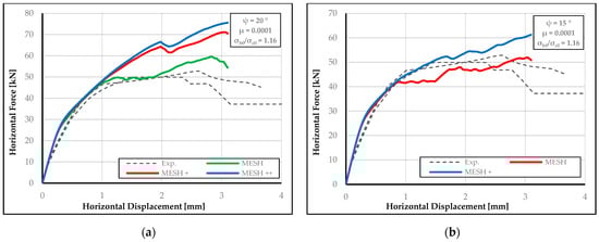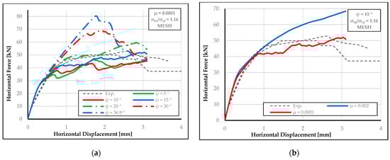 The curves thus obtained differ considerably from the previous ones (Figure 8a). It is evident, in fact, that by decreasing the viscosity, the curves become less smooth, with some softening branches, which, for example, for 30° or 36.5°, correspond to the change in the post-elastic stiffness in Figure 7. In detail, Figure 8b highlights that, with the dilation angle set equal to 15°, the use of a viscosity parameter equal to 0.002 leads to an increased strength bigger than the 15% of the strength obtained with a viscosity parameter equal to 0.0001. It seems clear that a viscosity parameter equal to 0.002, which is the value usually adopted for analysis at the building scale, leads to a non-negligible overestimation of the material strength.