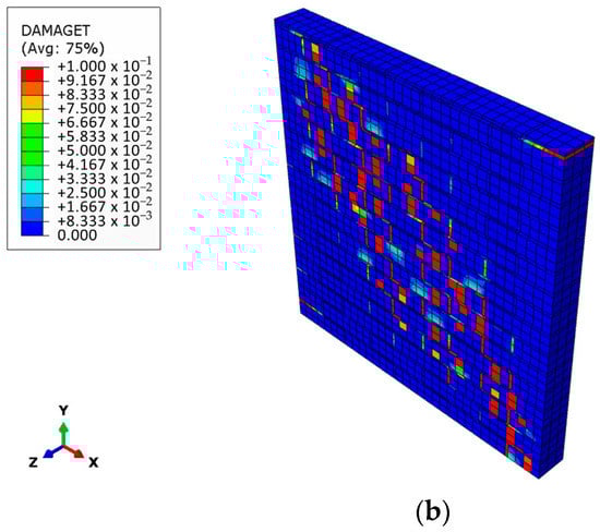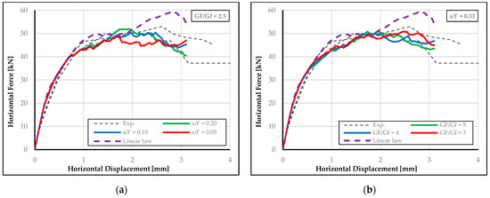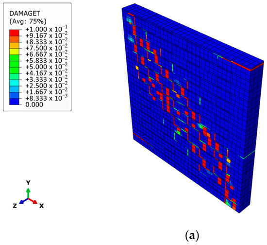 In the analyses carried out, some parameters have been kept constant: Table 2 reports the values assumed for the masonry blocks and Table 2 reports the values adopted for the mortar joints, in agreement with the benchmark data and the literature values for CDP [48,55,60]. Other parameters have instead been considered variable, and the corresponding values will be specified in each paragraph. These parameters (already presented above) are tagged with “variable” in Table 2. It should be noted that when one of these parameters has been varied, the other variable parameters have been fixed assuming a value that will be specified each time.