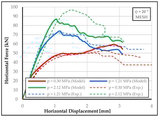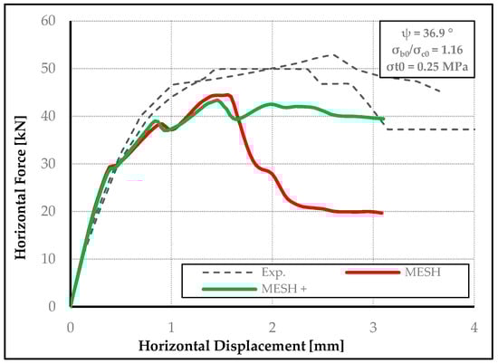 In the end, in this case, the mesh size only influenced the post-peak response; with a finer mesh, the residual strength was almost equal to the peak, while the other model shows a decided reduction in the shear load-bearing capacity. This change in response can be explained by the different load paths for the finer mesh than for the experimental one.