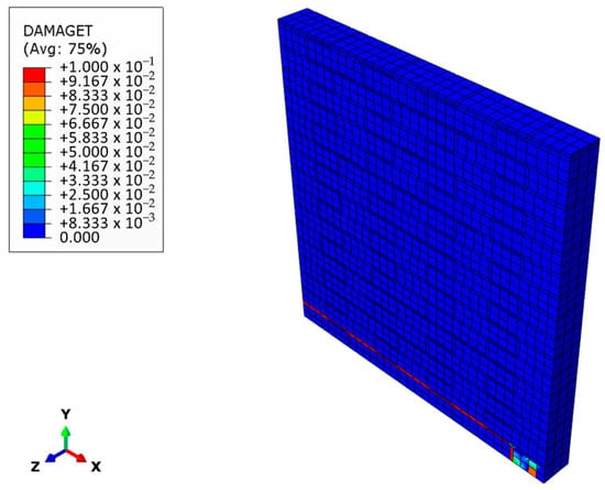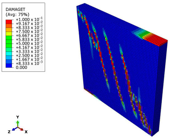 Coherently with the benchmark test, each model has first been subjected to a vertical and uniform pressure with a magnitude of 0.30 MPa at the top, and after, to a horizontal displacement of 0.0031 m applied to the top of the panel (Figure 4). The base of the panel is always fixed so a null displacement has been imposed in all directions. The vertical load and displacement have been applied to the model in two different steps. This means that, initially, the upper surface of the panel can move with certain displacement in the vertical direction under the vertical load. At the end of the application of the vertical load (first step), the actual value of the displacement is evaluated and applied as a boundary condition in the second step, keeping it constant throughout the second load step, in which horizontal displacement is applied. The upper face is constrained so that it can only move along the x-axis.