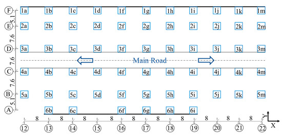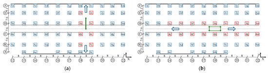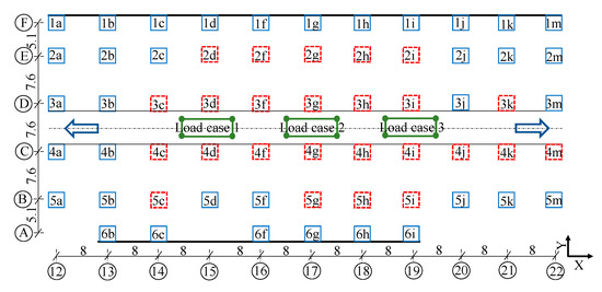 Furthermore, the different vehicle load cases are applied to the basement structure for analyzing the damage situation in comparison with the damage indicator mentioned in Section 3.1. The vehicle loads are placed in the middle of the travelling lane on both Y-direction (between Axis 18 and Axis 19) and X-direction (between Axis C and Axis D) roof plates, as illustrated in Figure 7a,b, respectively. The positions of the vehicle loads are indicated by the green dots. In Figure 7a, the 40 t vehicle load is simplified to two concentrated forces of 20 t with a front-to-back distance of 7.6 m. It is assumed that the pullout resistance of the foundations for the 2h, 2i, 3h, 3i, 4h, 4i, 5h and 5i columns have failed and are represented as red squares. In Figure 7b, the vehicle load is simplified as four concentrated forces of 10 t with an up-down distance of 2.5 m and a front-to-back distance of 8 m. Additionally, it is assumed that the foundations for the 3c, 4c, 3d, 4d, 3f, 4f, 3g, 4g, 3h, 4h, 3i, 4i, 3j, 4j, 3k, 4k, 3m and 4m columns are subject to pullout force loss. Under these vehicle load cases, the internal forces, bending moments and maximum lateral displacements of some representative columns are calculated and listed in Table 4 and Table 5, respectively.