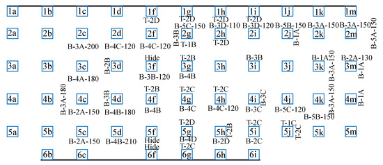 Due to the rising water table during the rainy season in southern regions [30,31], it is preliminarily judged that the significant buoyancy forces will likely occur at the base plate of the basement. Based on the literature sources [32,33,34,35], it is assumed that the groundwater level in this project example is 3 m below the standard horizontal level. The buoyancy force exerted on the bottom slab can be equivalent to the vertical upward concentrated force 127.44 kN loaded on all nodes located below the bottom slab. The effect of water buoyancy force on the shear wall is 28.8 kN. Meanwhile, the dead load of the structure is equal to 39.269 kN. The heavy loads can also be equivalent to the vertical downward concentrated load 54.5 kN applied to the nodes on the top slab.