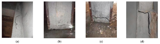 According to the on-site inspection, a significant number of reinforced concrete walls and columns in the basement exhibit cracks, primarily concentrated within Axes 12–22 and Axes A–F as depicted in Figure 2. At the onset of the cracking, only a limited number of fissures appear on the walls and columns with minimal degrees of severity. As cracks progress, their quantity increases while damage intensifies. After further development, the number of cracks increases and their severity worsens. The cracks mainly take a horizontal form and penetrate partially through the cross-section of the column. Additionally, a few cracks exhibit the full-sectional penetration. Based on the severity of the damage, these cracks can be categorized into four levels (Levels A, B, C and D) with the increasing degrees of cracking as illustrated in Figure 3. Between Axis 14 and Axis 22, a total of 47 columns displayed significant cracks. Among them, Level C cracks were observed in 20 columns. The columns on Axis 12 and Axis 13 do not exhibit any observed cracks. The majority of cracks are between Level B and Level C, situated at the bottom and top of the columns and oriented towards adjacent high-rise buildings. Columns located in close proximity to high-rise residential buildings, such as those on Axes B, C, E and F, display more severe degrees of cracking when compared to those on Axis D. Some cracks with a diagonal upward orientation of 45° appear at the intersections between the columns situated on the outer sidewalls and the beams of the top slab. These cracks have progressed to damage of Level D, with widths exceeding 2 mm and lengths in excess of 1 m for certain columns.