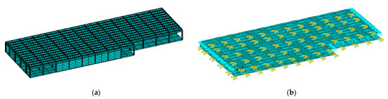 Due to the influence of the adjacent high-rise buildings, the positive restraints in the X-direction can be observed at the top of the columns on Axis 12, while a series of negative restraints in the X-direction are applied to those on Axis 22 to restrict the nodal movement. The initial state of the damaged area is assumed to be intact under normal circumstances. Therefore, apart from these aforementioned nodes, all other nodes at both ends of each column are considered as rigid joints under the action of pile foundation and casing soil. The corresponding constraints of the FE model are illustrated in Figure 4b.