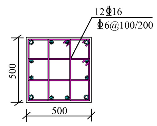 In this section, the frame column in the basement is taken as an example. The concrete strength is C40 and the longitudinal bars in the column have a strength of HRB400. The stress–strain relationship of both materials, including concrete and steel, was obtained from the literature [36]. Considering that the KZ2 column type is frequently used, its cross-section and reinforcement forms are shown in Figure 6. According to the load combination specified in Code [37], the design value of axial force controlled by permanent load effect is 736.95 kN. To ensure calculation accuracy, the concrete in the compression zone is divided into 20 layers. Table 3 lists the bending moments at all stages of the KZ2 column under the vehicle loads. Cracks begin to appear when the bending moment reaches the Stage 1 cracking moment of 97.37 kN·m. When the bending moment of the column exceeds the Stage 2 cracking moment of 106.33 kN·m, the concrete protective layer will be penetrated by cracks in the column. Once the bending moment reaches the Stage 3 moment of 265.17 kN·m, these developed cracks will cause plastic deformation in the column.