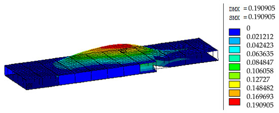 Thus, the loading measures are conducted by laying a 150 mm thick layer of concrete and an 800 mm thick layer of casing soil on top of the basement’s top slab. To simulate the reinforcement model, the water buoyancy force is applied to the basement floor, consistent with the conditions in Section 3. Two comparative cases are considered regarding whether or not the foundation of the basement loses pullout resistance. The bending moments and deformations of the basement are illustrated in Figure 11 and Figure 12, respectively. As shown in Figure 11, the maximum moment of columns is 88.135 kN·m when column foundations possess sufficient pullout resistance. However, if there is a failure in pullout resistance, the maximum moment will escalate to 1020 kN·m. In Figure 12, the maximum vertical displacement of the basement is 5.314 mm under pullout resistance, while it increases to 65.931 mm once the partial restraints of column bases are released.