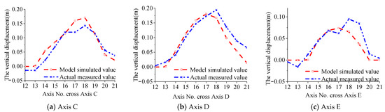 Under these various load cases, the maximum uplift deformation of the basement can be obtained from Figure 9. It is evident from Figure 9 that the maximum uplift deformation of the basement is 0.191 m, which closely approximates the actual maximum uplift deformation of 0.194 m observed in situ. To further validate the effectiveness of the antifloating failure model, we have selected 30 damaged columns (including 2a to 2k, 3a to 3k and 4a to 4k) at Axis C to Axis E and compared their upward uplift displacements with actual measured values. The results are presented in Figure 10. As shown in Figure 10, the simulated uplift deformation values of the basement floor from the FE model are highly consistent with actual measurements. Based on Figure 10, it is evident that the modeled uplift deformation of the basement floor exhibits a high level of agreement with actual measured values, with maximum errors falling within 14%.