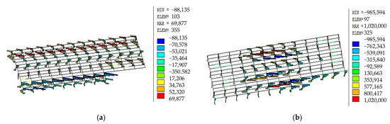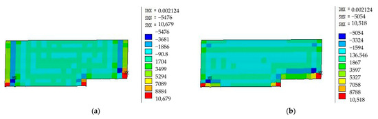 In addition, the 150 mm thick concrete is poured onto the basement floor slab. The pullout resistance stabilization and failure scenarios are simulated to determine the bending moments of the floor slab, as depicted in Figure 13. From Figure 13, the maximum bending moment of the floor slab is 10.679 kN·m when all column bottoms are rigidly constrained. However, with the locally released constraints at the column bottoms, this value increases to 70.013 kN·m.