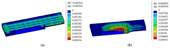 Vertical displacements of the basement structure after reinforcement (m). (a) Pullout resistance stabilization. (b) Pullout resistance failure.