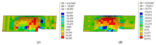 The bending moment of the floor slab after reinforcement (N·m). (a) Mx in the pullout resistance stabilization. (b) My in the pullout resistance stabilization. (c) Mx in the pullout resistance failure. (d) My in the pullout resistance failure.