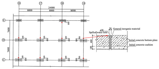 - Reposition the water spillage holes in close proximity to the damaged columns [39]. The dimensions and locations of the designated water spillage holes are depicted in Figure 14. As shown in the figure, nine circular apertures with a diameter of 20 mm have been drilled and marked as red circles. These holes serve to alleviate the uplifting effect of water buoyancy on the basement floor by facilitating groundwater discharge. During the decompression period, it is necessary to regularly monitor the settlement of the bottom slab. Once the original groundwater has been released through the spillage holes, a sump pump should be used to drain any remaining open water and prevent backflow into the spillage holes.