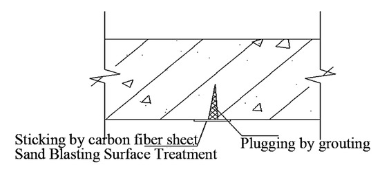 - Plug the cracks in the components. Cracks in the columns, beams, slabs and walls require grouting treatment [40]. After sealing the cracks with grout, the carbon fiber sheets are utilized to reinforce the top slab surface as depicted in Figure 15.