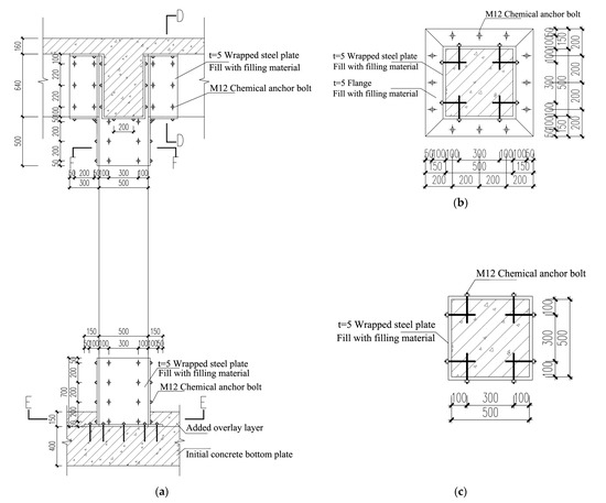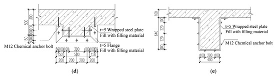 - Reinforce the damaged columns with the U-shaped steel [41]. The U-shaped steel reinforcement measures for the side columns (KZ1) and main columns (KZ2) are illustrated in Figure 16 and Figure 17, respectively. The steel plates are installed between 650 mm below the bottom of the beam and 650 mm above the base plate.