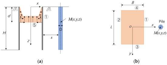 According to Mindlin’s formula [,], additional lateral stress due to vertical unloading and lateral unloading at point M (x, y, z) on the pile centerline can be expressed as follows: