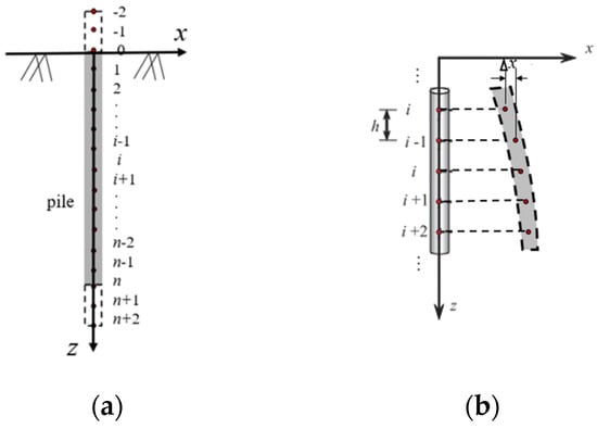 However, the equation of homogenous difference of the fourth order presented in Equation (11) poses a challenge when attempting to find a solution. Consequently, it is necessary to employ the finite difference method to determine the equilibrium differential equation with the pile boundary condition. As shown in Equation (12):