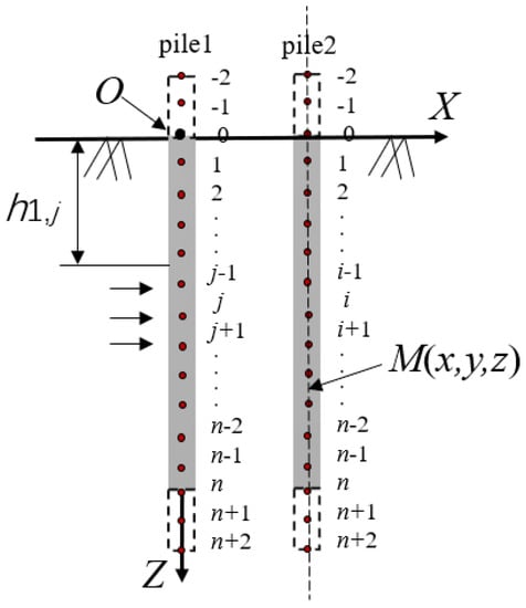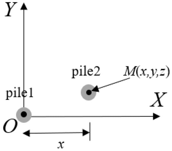 In view of the complexity of pile group interaction, an analysis of the reaction between two piles is conducted first and then extended to the whole pile group by applying the principle of superposition. Figure 4 and Figure 5 show that x represents the distance between two points, pile 1 and pile 2, in the X direction of the horizontal plane; pile 1 represents an acting pile for a lateral force, while pile 2 represents a responding pile for a lateral force with pile-soil interaction.