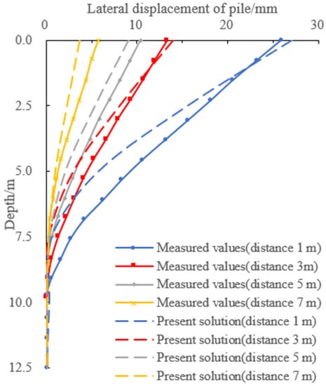 Ong et al. [] presented a set of centrifuge experiments in standard kaolin clay to evaluate the lateral displacement on a nearby individual pile behind the retaining wall induced by excavation. Within the soft clay, the retaining wall was embedded to a depth of 8 m and subjected to an excavation of 1.2 m. The model pile was constructed from a 12.6 mm wide hollow aluminum tube. The bending rigidity EI of the prototype pile was measured to be 2.2 × 105 kN·m2, equivalent to a pile of 600 mm diameter. In this context, the majority of the parameters required were also employed by Ong et al. []. Notice that the measured values in Figure 6 are the results of the centrifuge tests, and the present solution is the result of the analytical approach in the paper. Figure 6 presents the calculated lateral deformation of the free-headed pile compared with the measured results, with the distance between the face of excavation and the pile center being 1 m, 3 m, 5 m, and 7 m, and it is shown that the computed results correspond well with the measured results.