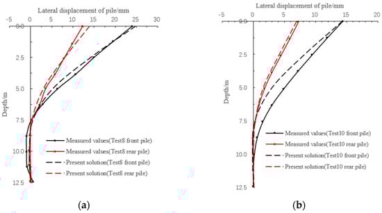 Figure 7a,b demonstrates the comparison of lateral displacement curves between the present solution and measured results for free-head 2 piles with Test 8 and Test 10, respectively. It is pointed out that the analysis reveals satisfactory agreement between the computed and measured values. The investigation also observed that the impact of pile-pile interaction on Test 8 is greater compared to Test 10, taking into account the shielding influence of the front piles on the rear piles. Furthermore, the front pile is closer to the retaining wall, which gives a more pronounced response to the rear pile. Therefore, maintaining an appropriate clearance of retaining walls to piles can effectively reduce the lateral displacement of the piles induced by excavation.