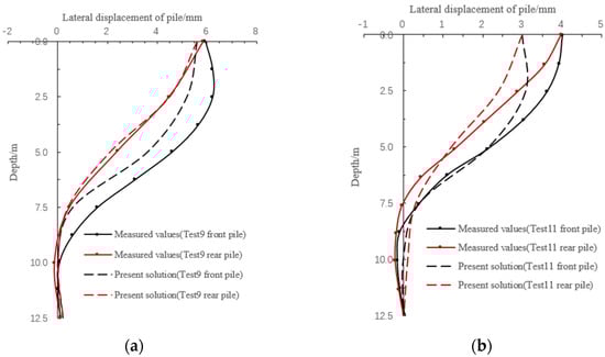 Comparison of lateral displacement curves between the present solution and measured for capped-head 2-pile groups: (a) Test 9; (b) Test 11.