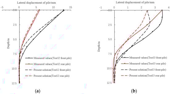 Comparison of lateral displacement curves between the present solution and measured for the 4 pile groups: (a) Test 12; (b) Test 13.