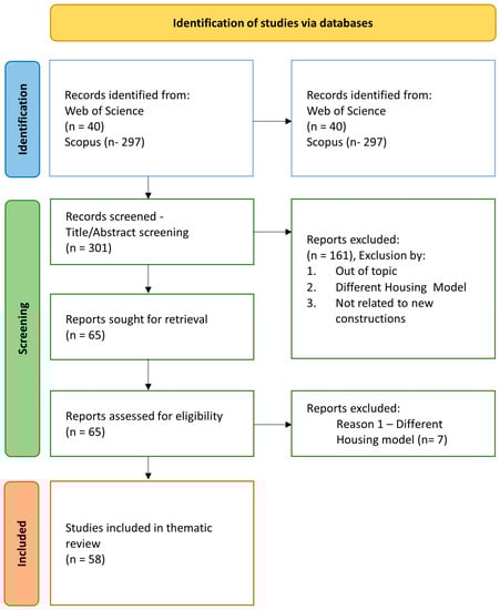 Inclusion—A total of 58 articles remained for the thematic analysis, with the objective of identifying the key themes of the BTR housing model in the current literature. The whole process is illustrated in Figure 1.